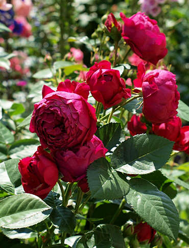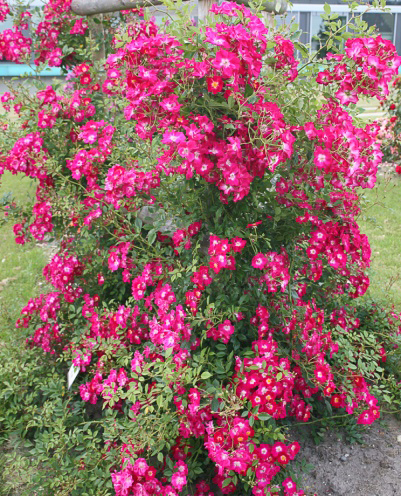 ‘Florentina®’ hod. W. Kordes’ Söhne 2016. Dorasta do wysokości 250 cm, jest obsypana licznymi ciemnoczerwonymi kwiatami o średnicy 8-10 cm – kwitnie spektakularnie i powtarza kwitnienie w ciągu sezonu.