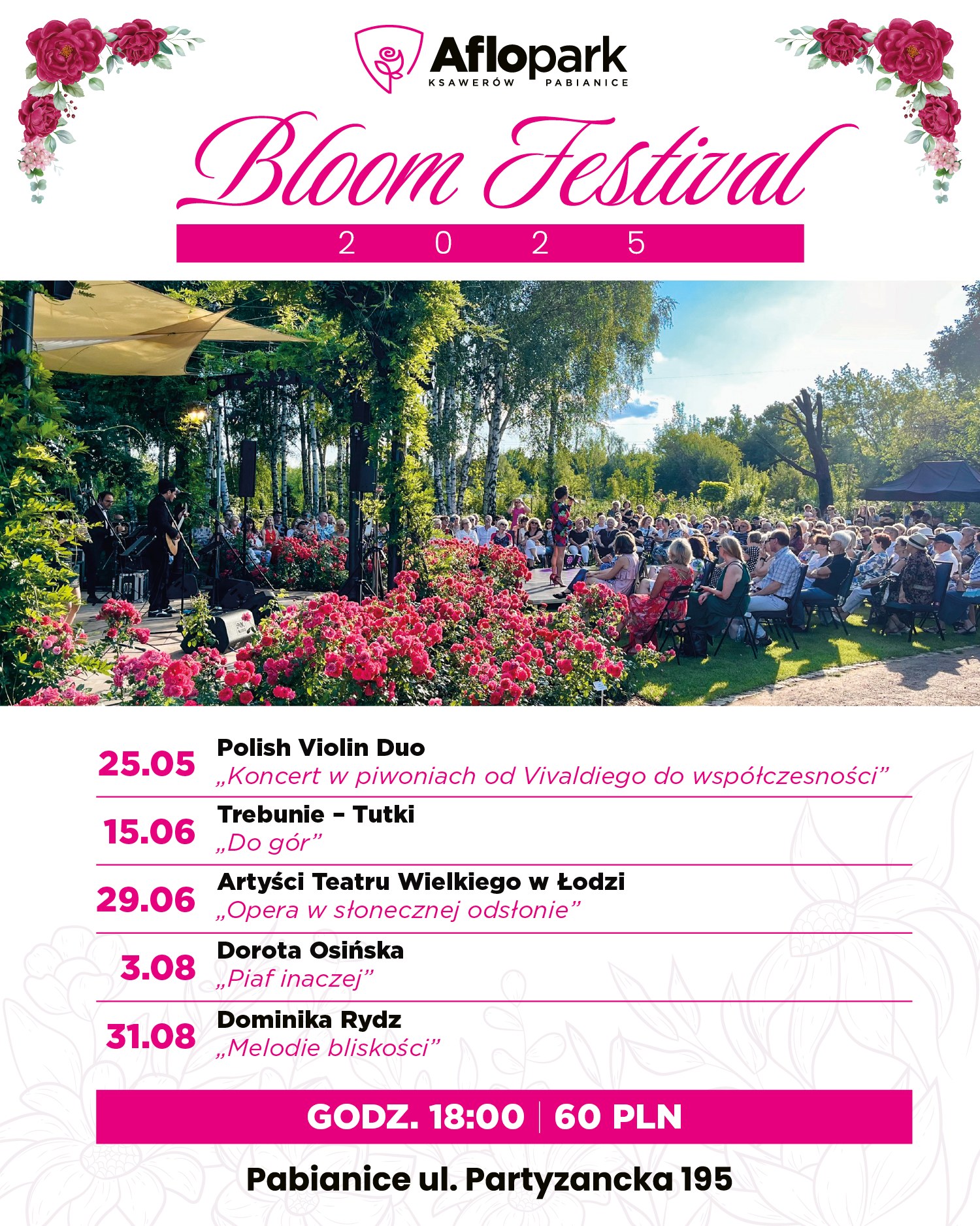 Kolejny „Bloom Festiwal” 2025 odbywający się w Ogrodzie Grażyny i Andrzeja Furmanów Aflopark w Pabianicach startuje 25 maja 2025. Cena biletu na każdy koncert – 60 zł.
