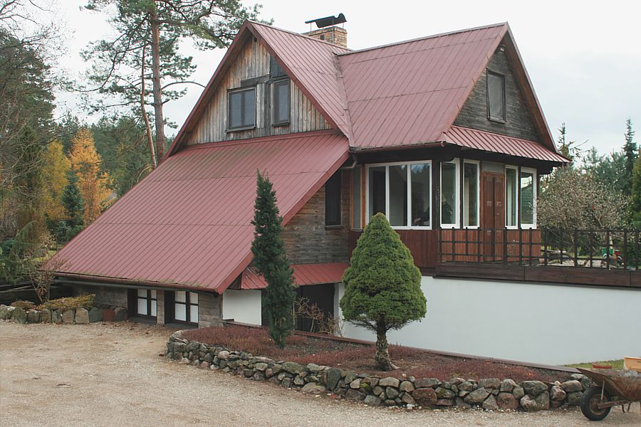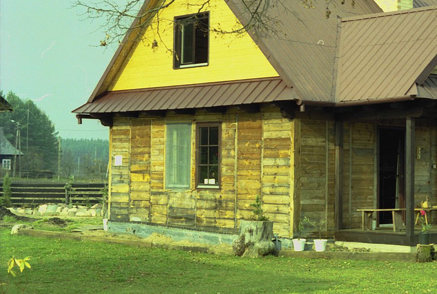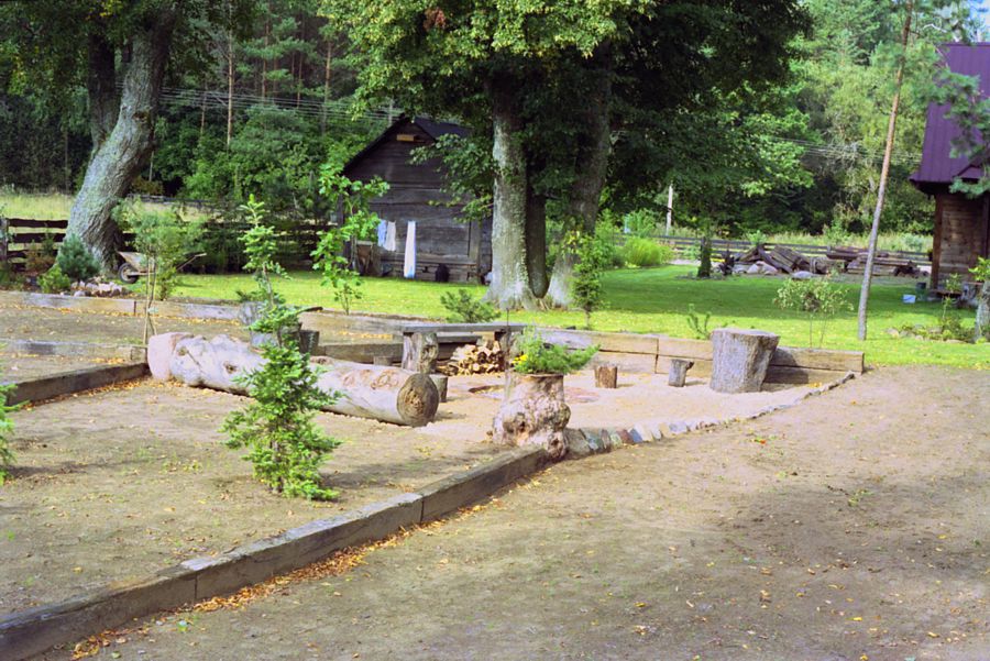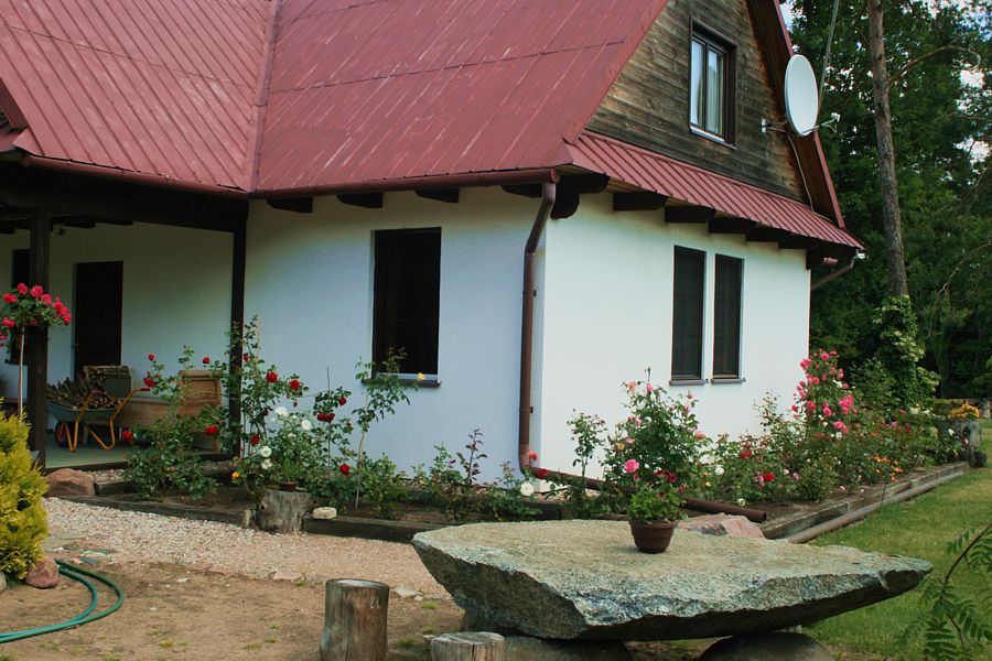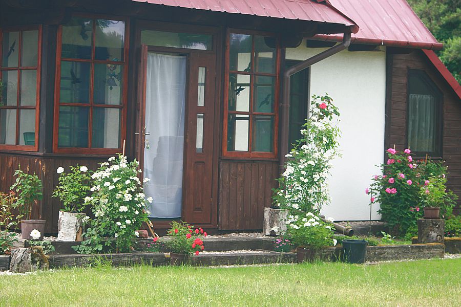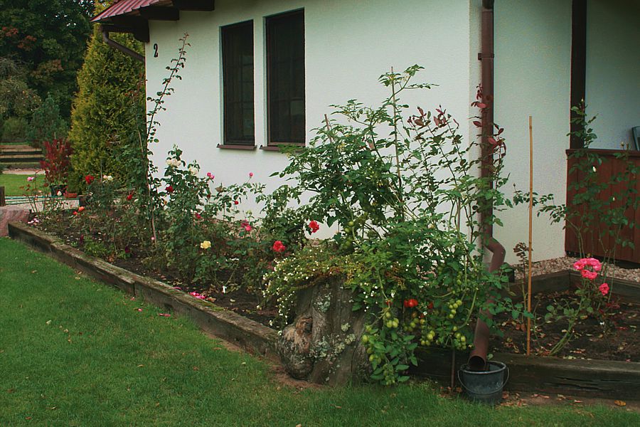 No więc tak, żeby dom wyrastał z kwiatów, to najpierw trzeba zrobić tym kwiatom rabatę. Ja to zrobiłem w ten sposób, że obramowaniem rabaty były podkłady kolejowe, a łącznikami w narożnikach i załamaniach obramowania były wydrążone pieńki, zwykłe pieńki i kamienie. Te wydrążone pieńki pochodzą ze złamanej wichurą sosny, pamiętającej chyba budowę Kanału Augustowskiego, bo rosła blisko Kanału.