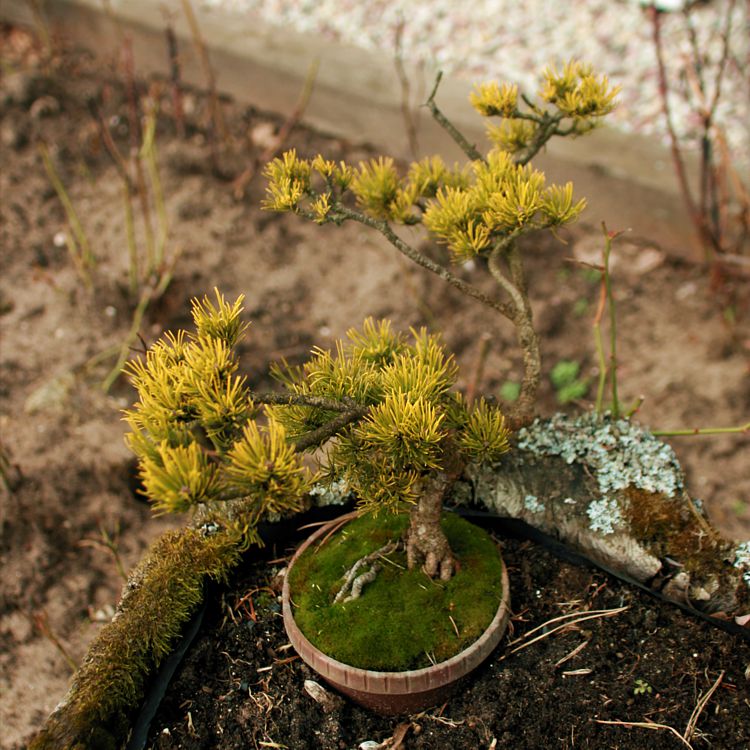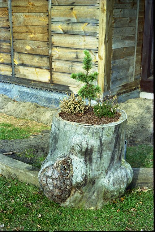Jak już pisałem w pierwszej części historii mojego ogrodu pierwsze nasadzenia to były sosny i sentyment do nich pozostał, dlatego w te pieńki są wstawione sosny, posadzone w pojemnikach w formie naturalnego (tzn. nie formowanego) bonsai.