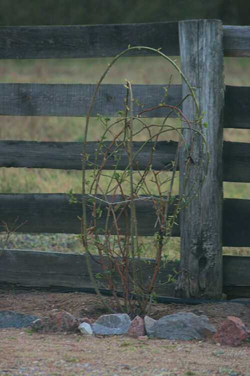Mateczny krzew róży 'Parfume de l’Hay’ wiosną został „zawinięty” zgodnie z metodą Ojca.