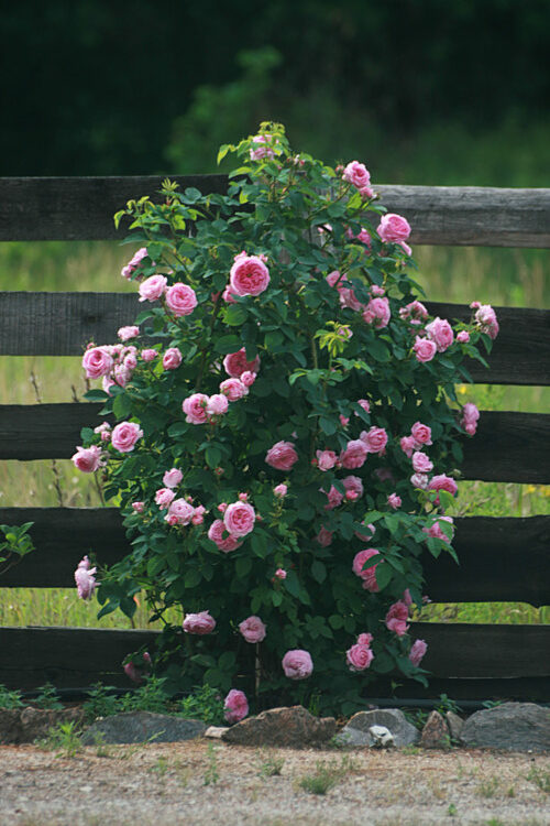Róża 'Babiccina Vonava’ prowadzona metodą „zawijania róży” obsypana kwiatami na całej wysokości.