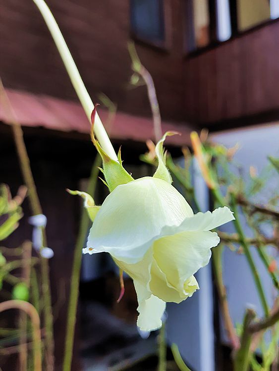 26-go marca 2021 roku wyciągam je z garażu po przyjeździe i okazuje się, że róża 'Jan Paweł II’, okulizowana na pniu, w ciemnym garażu zakwitła. Widać na zdjęciu, że nawet łodyżka kwiatu jest biała z braku światła.