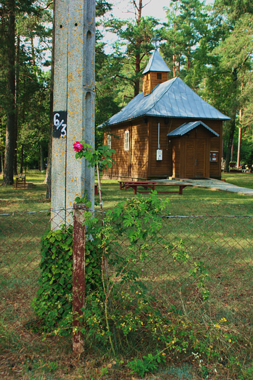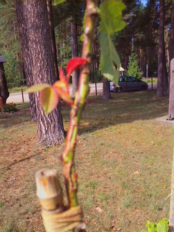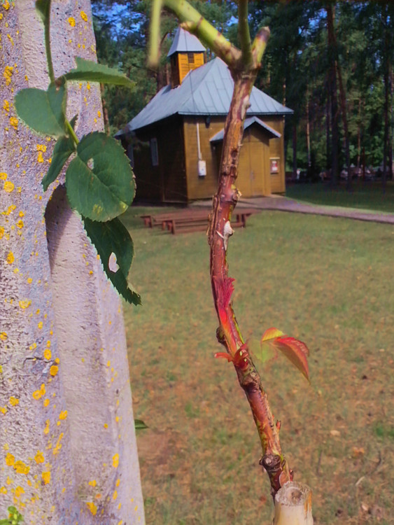 Ponieważ Ojciec bardzo często okulizował róże w najmniej spodziewanych miejscach, to i mnie się to udało. Otóż, kilometr od mojego ogrodu w Kudrynkach jest ponad 200-letnia kaplica, której patronuje św. Anna. Przy siatkowym ogrodzeniu tej kaplicy rośnie sobie od wielu lat zwykła dzika róża (rosa canina). W 2020 roku jeden z silniejszych pędów przywiązałem do bambusowego palika, oczyściłem z bocznych pędów i 30-go czerwca założyłem na tym pędzie dwa oczka róży 'Parfume de l’Hay.