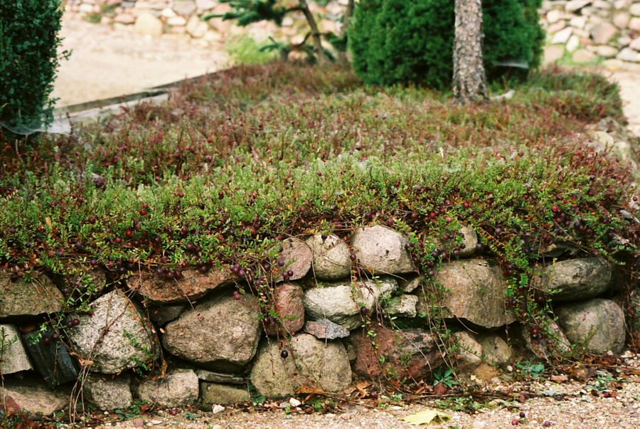 Zaczniemy od strony północnej domu. Ponieważ okna garażu są na poziomie podwórka, to rabata jest trochę przesunięta równo ze zjazdem do garażu i na niej rośnie żurawina wielkoowocowa, a z drugiej strony okien jest maleńka rabata, na której króluje azalia 'Silver Slipper’, a obok rabaty widać pochyły zjazd na dolne podwórko.