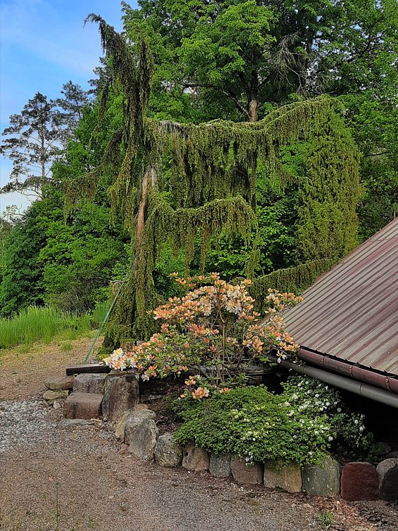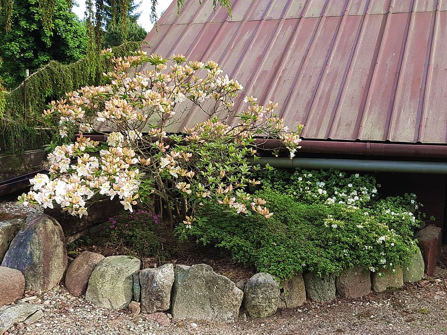 Strona północna domu – na rabacie króluje azalia 'Silver Slipper’.