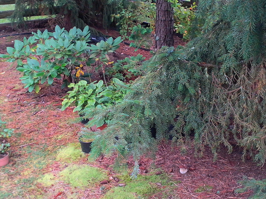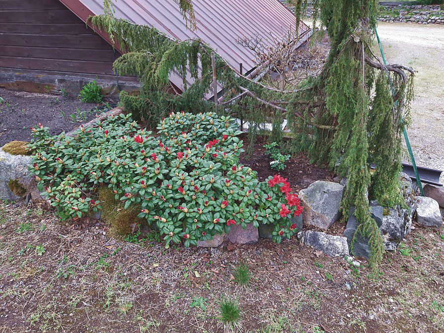 Różanecznik rozesłany 'Baden-Baden’, jałowiec pospolity 'Horstman’.