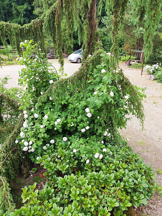 Narożnik północno-wschodni to też maleńka rabatka z różanecznikiem rozesłanym 'Baden-Baden’, jałowcem pospolitym 'Horstman’ oraz różą 'Felicite et Perpetue’.