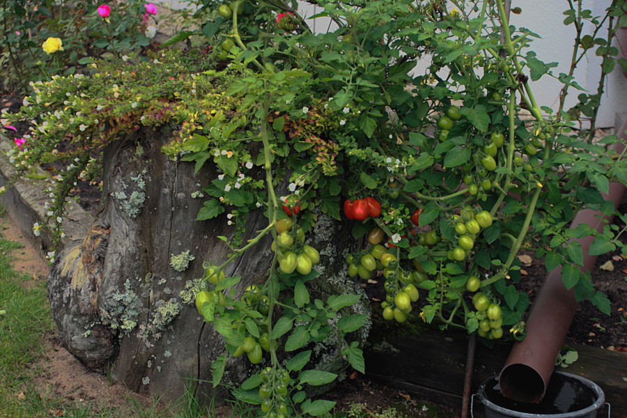 W 2013 roku w pieńku od strony południowo-wschodniej wymieniałem ziemię i okazało się, że w kompoście, który był głównym składnikiem, przetrwało ziarenko pomidora z resztek jedzenia wyrzucanych do kompostownika. Efekt – jak widać na zdjęciach poniżej.