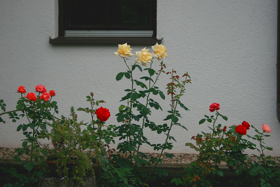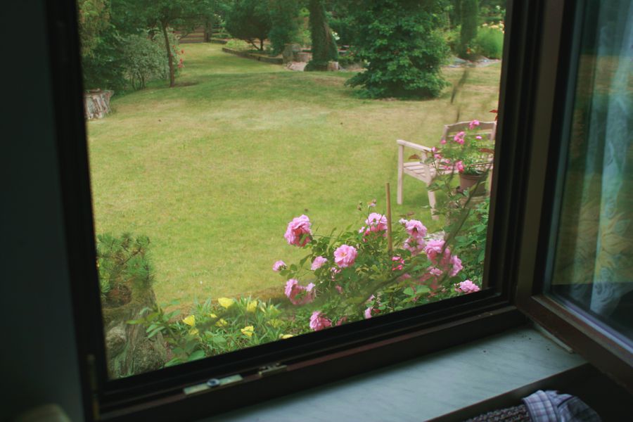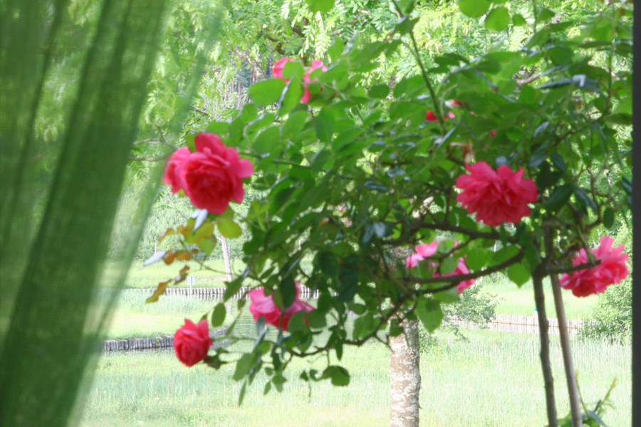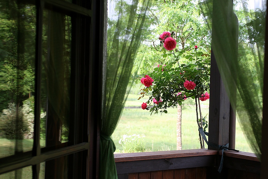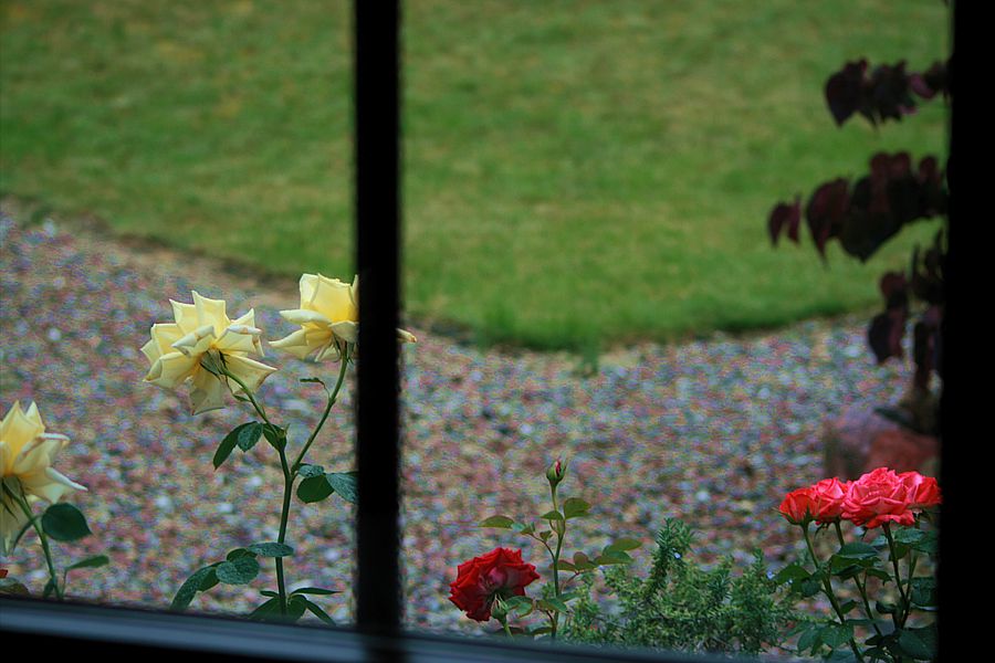 Widok przez okno w dużym pokoju od strony zachodniej. Przez to okno prezentują się róże, których już prawie nie ma w handlu, a są to – żółta 'Landora’ i moja kolejna miłość 'Super Star’, a przed samym oknem 'Mr Lincoln’.