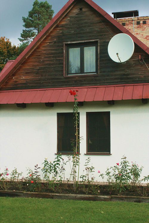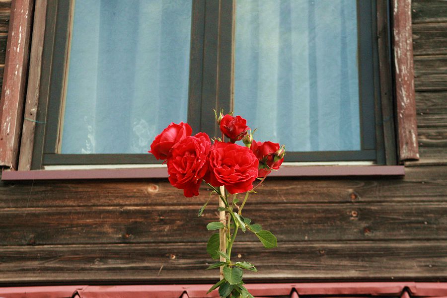 Róża 'Sypathie’ wspinająca się do okna pokoju na poddaszu
