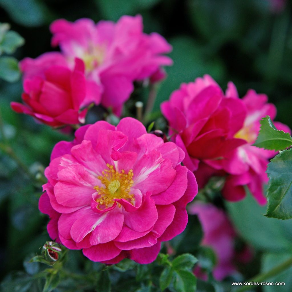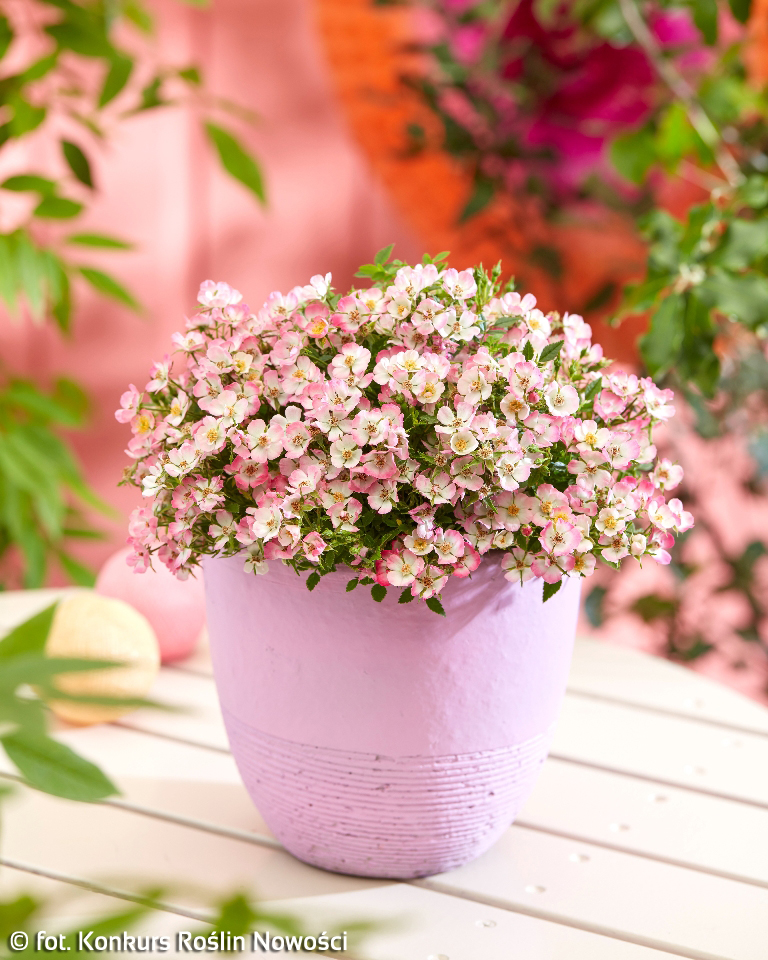 Róża okrywowa kwitnąca przez cały sezon z gałązkami przewieszającymi się, pokryta drobnymi kwiatami. Odmiana chętnie kupowana i łatwa w uprawie.