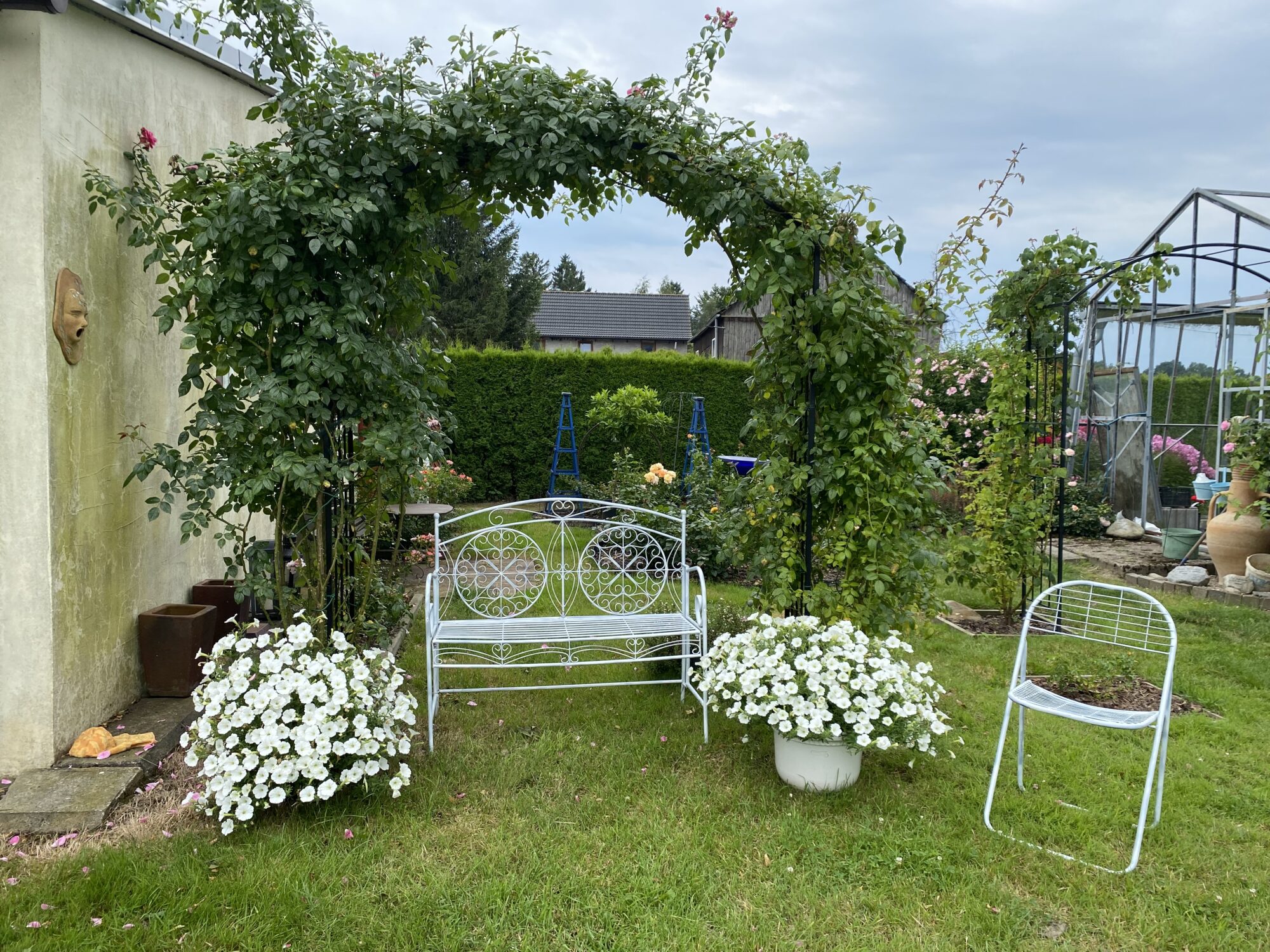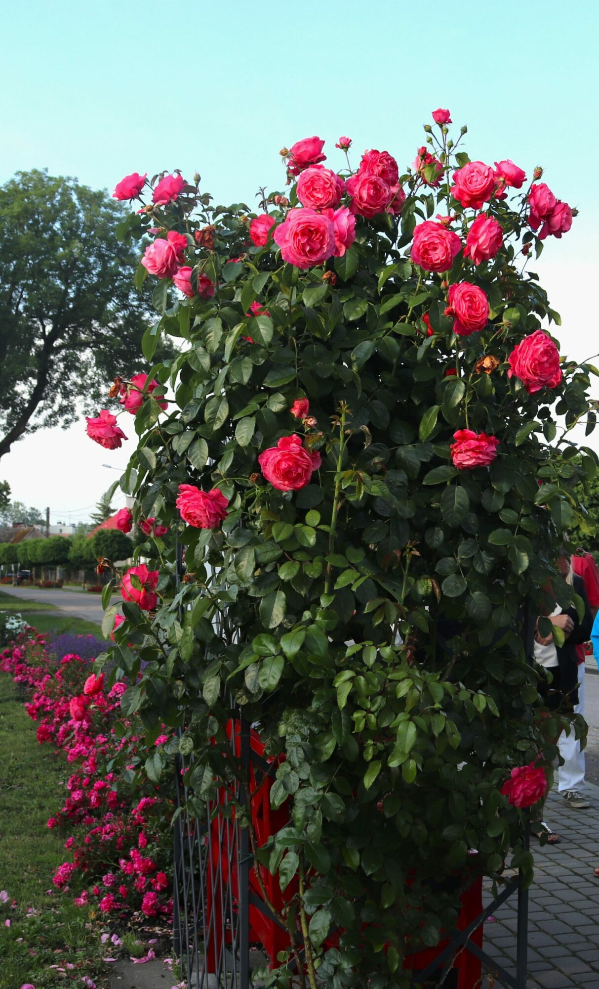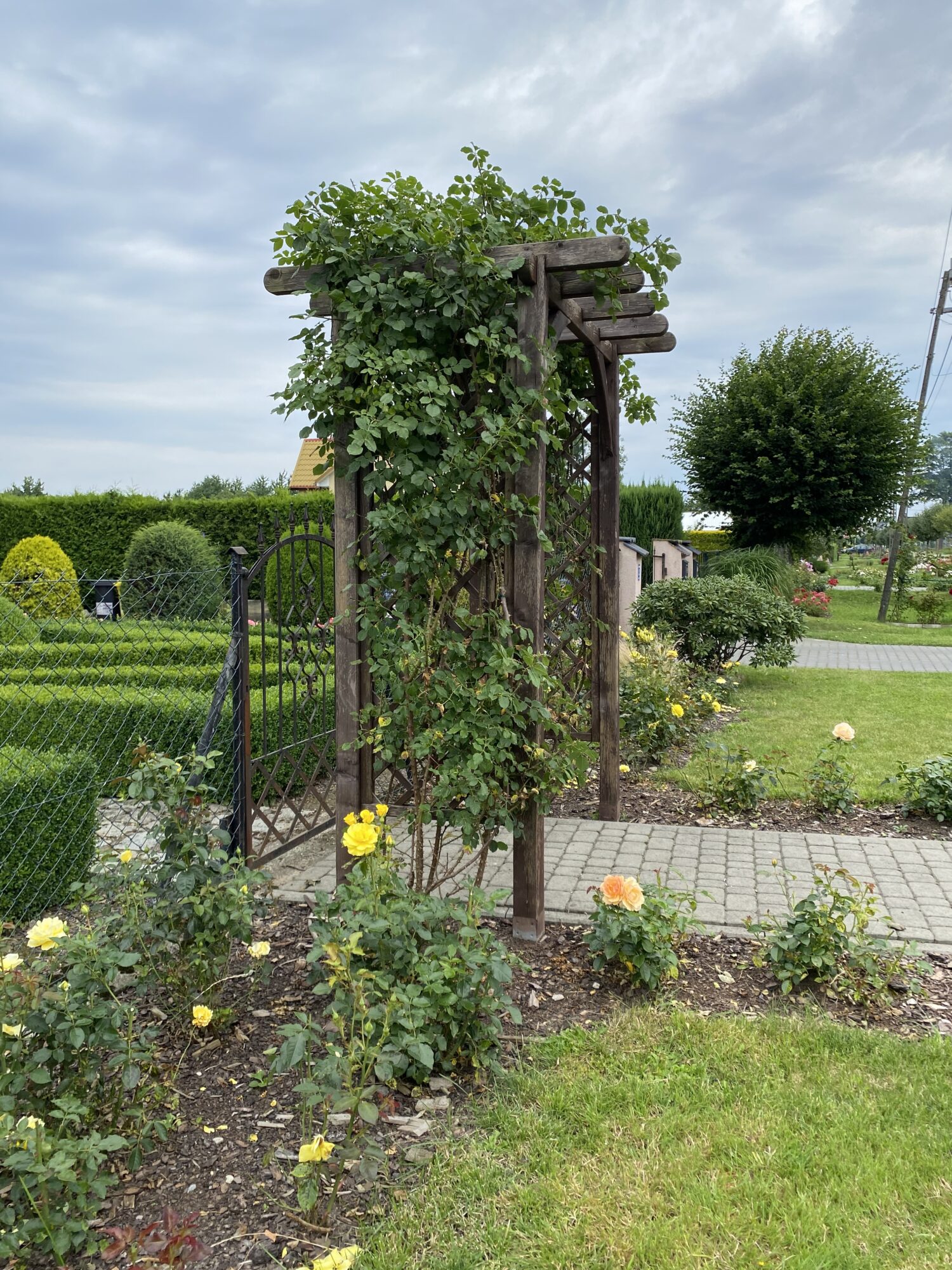 Co trzeba zrobić, żeby różę utrzymać ładnie na pergoli: „systematycznie przeplatać młode pędy przez szczebelki pergoli , obcinać przekwitnięte kwiaty. Jeśli zapytacie kto się tym u nas zajmuje – jest nas kilka osób które chętnie to robią.   Dużo ludzi zagląda do nas i podziwia jaka piękna wieś”.