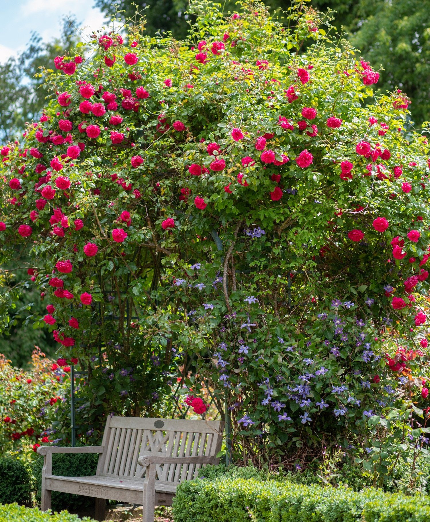 Ławeczka na posesji Barbary Stachury – na zdjęciu róża 'Camelot’ już przekwitła