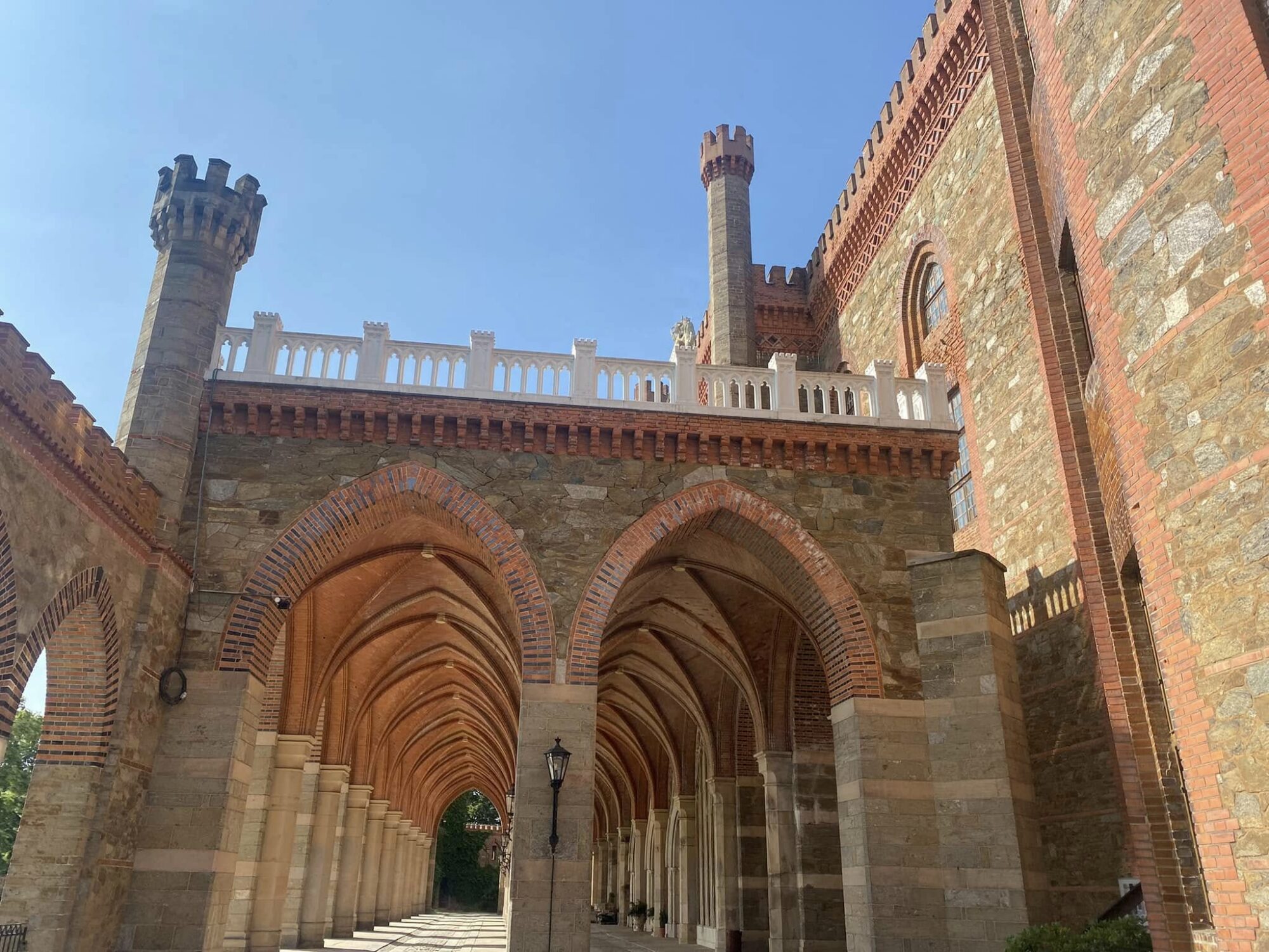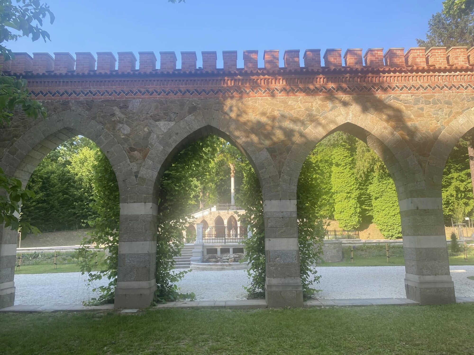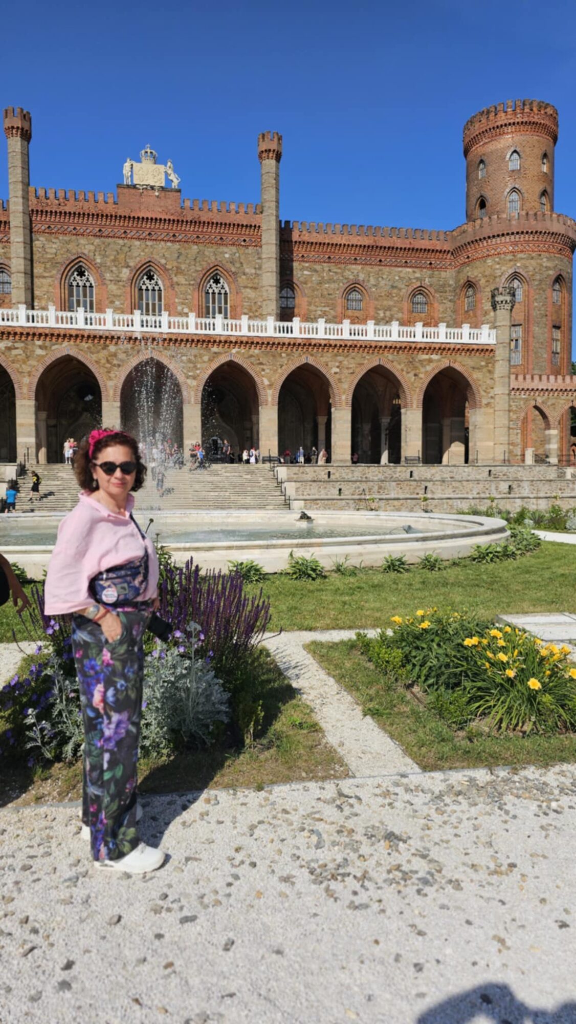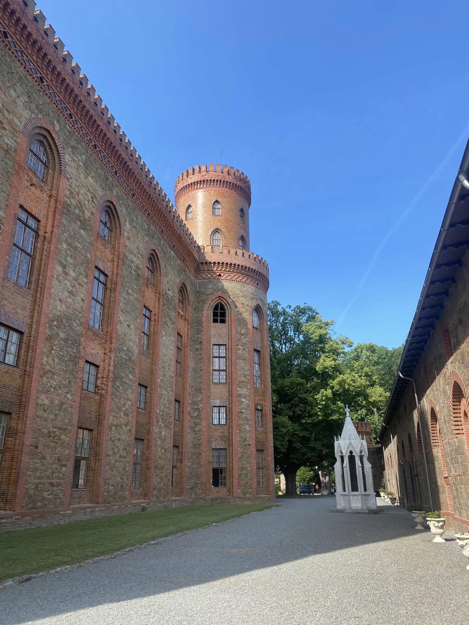 Pałac Marianny Orańskiej w Kamieńcu Ząbkowickim to skala XXL. Budowla w stylu neogotyckim położona na wzgórzu, w parku pełnym okazałych drzew. Do Zamku prowadzi pnąca się pod górę wybrukowana granitowym łupkiem droga. Z jej poziomu Zamek jest jeszcze wyższy. Budowę pałacu zleciła Marianna Orańska – córka króla Niderlandów Wilhelma I Orańskiego i jego pierwszej żony – Fryderyki Luizy Pruskiej, żona najmłodszego syna króla Prus – Albrechta Hohenzollerna. Marianna – kobieta wykształcona, inteligentna, przedsiębiorcza i na dokładkę piękna, szczęścia w miłości nie miała… Historia to dłuższa, burzliwa i smutna. Marianna dziedziczy po matce majątek w ziemi kłodzkiej i tam pomnaża go sprawnie – inwestuje w kolejne ziemie, lasy i rozmaite przedsięwzięcia biznesowe – od pieca hutniczego, poprzez farmy krów, hodowlę pstrąga, cegielnię, kamieniołomy marmuru (któż nie zna ,,białej marianny”?, a jest też zielona), po hutę szkła kryształowego w Stroniu (kupiłam tam kiedyś piękne kieliszki i wazony na kwiaty – jak jeszcze istniała ). Marianna dba o ludzi i rozwój regionu – buduje drogi, szpital, ochronkę, a przede wszystkim daje pracę. Projekt pałacu zleca architektowi Karlowi Schinkelowi (autor Zamku w Książu), ogród tworzy Peter Josef Lenne… Zatem same ówczesne tuzy… Budowa rozpoczyna się w 1839 r. i trwa z przerwami 33 lata. Kosztuje równowartość 3 ton złota… Warto zagłębić się historię Marianny – jej siłę charakteru, determinację, talenty i nieszczęśliwą miłość, ale też odwagę w dążeniu do zachowania godności. Tymczasem wracam do wrażeń z wizyty w pałacu i ogrodzie. Splądrowany pod koniec wojny, zniszczony przez Armię Czerwoną, nadpalony i rozgrabiony z wyposażenia jest obecnie w zaawansowanym stopniu odrestaurowany i to naprawdę jest imponująca robota! Ogród jest już prawie gotowy – dorasta.