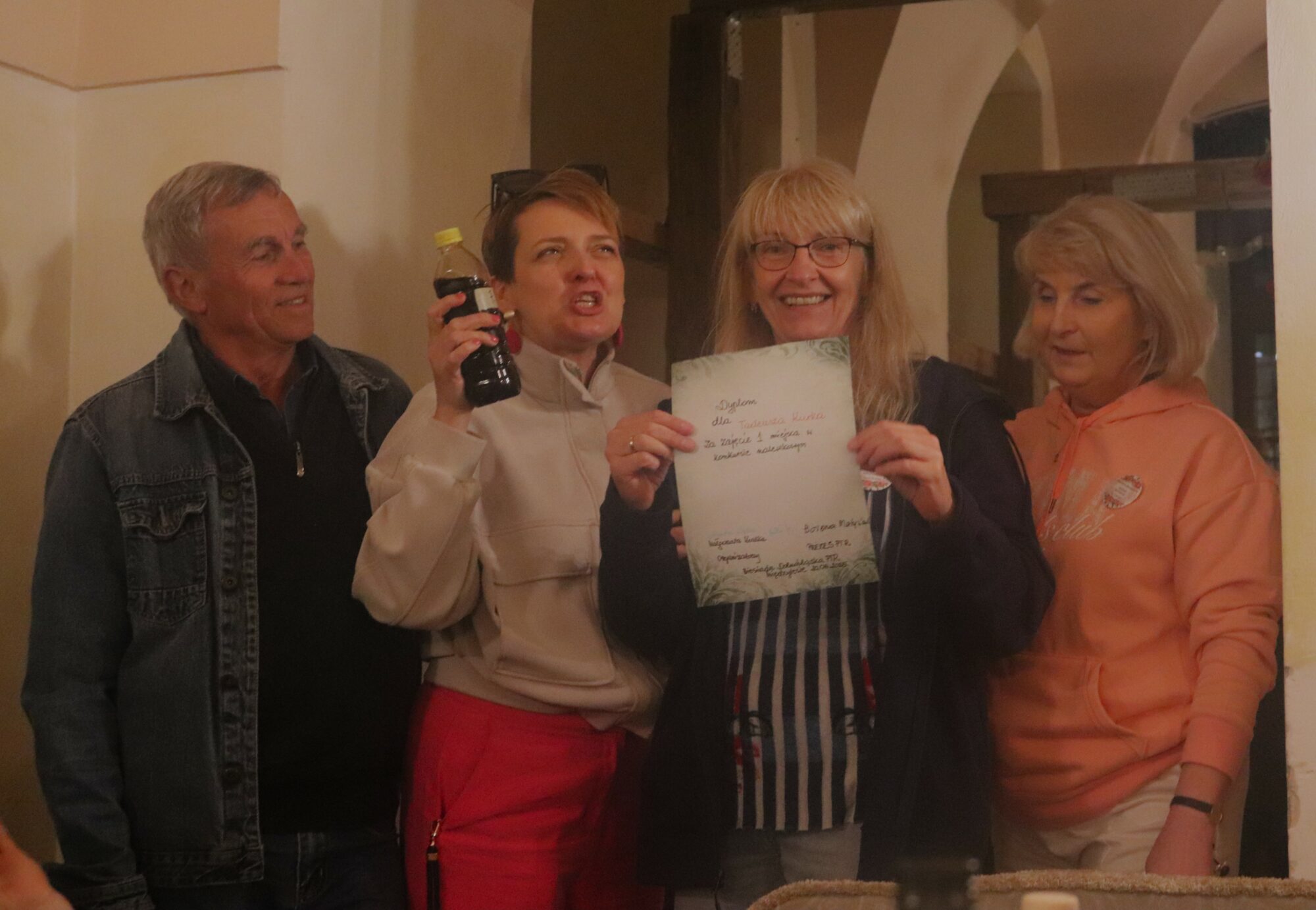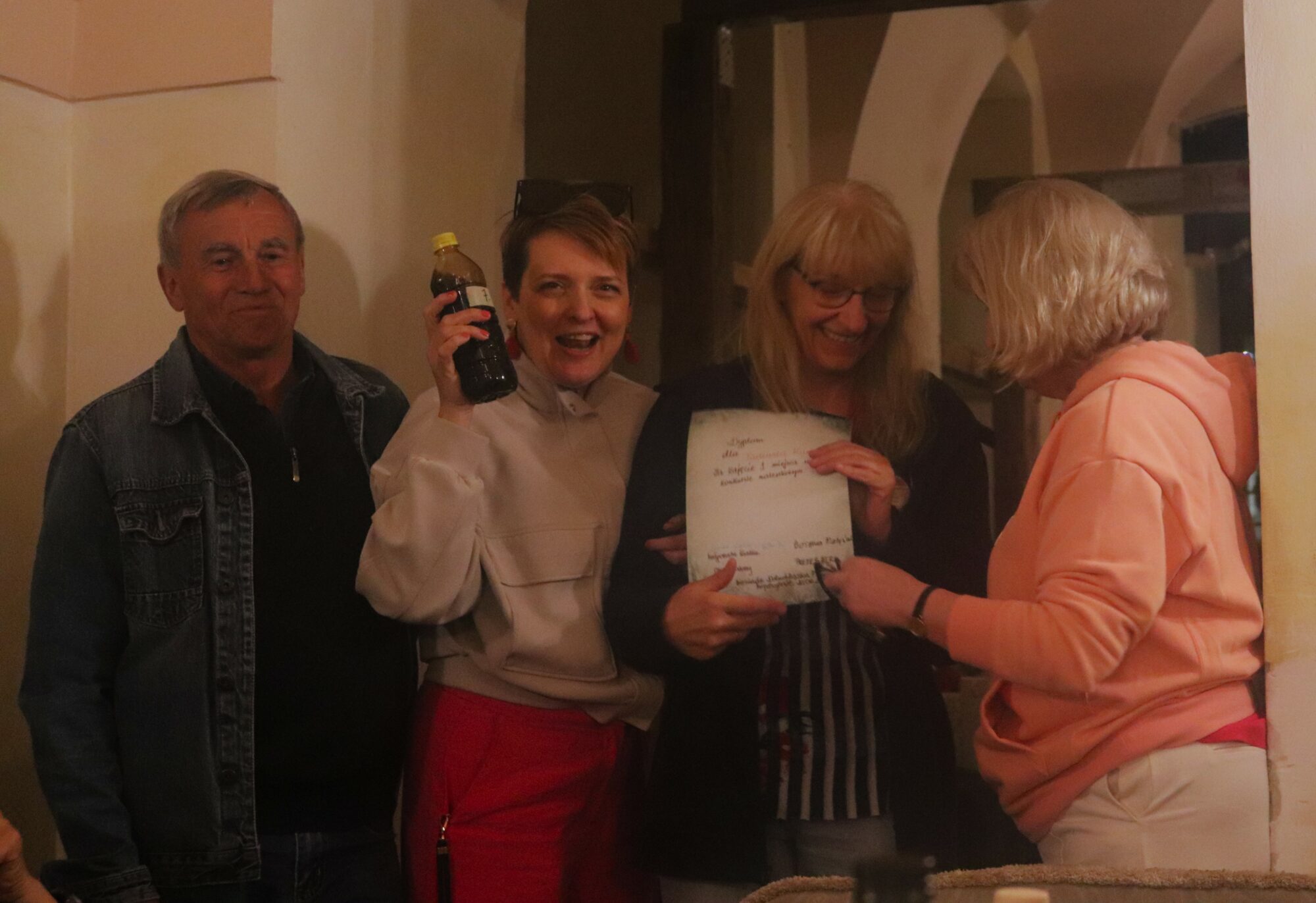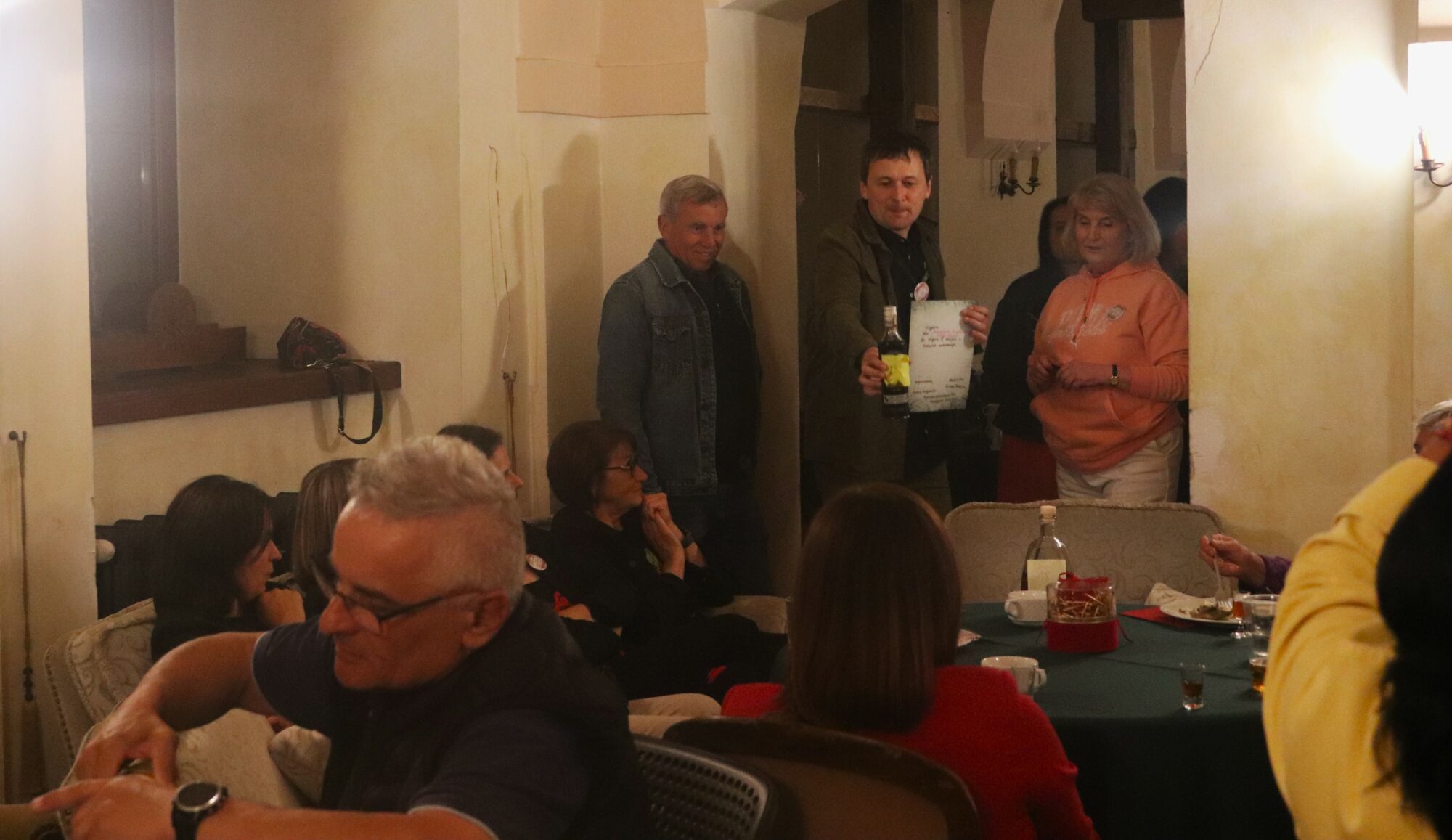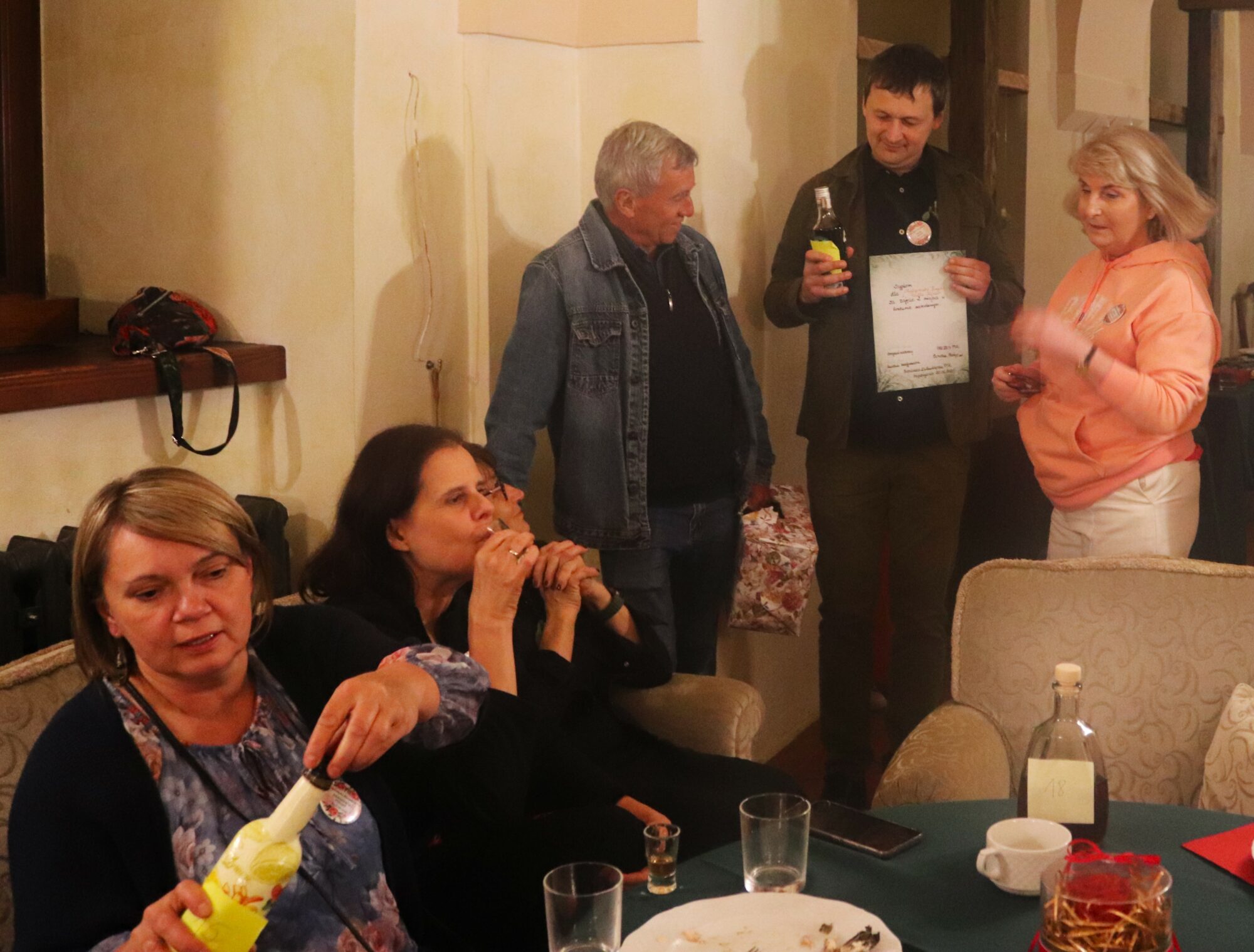Degustacja, rozpoznawanie składników i ocena nalewek trochę trwało. Zrobiło się ciemno i zimno. Grupa przeniosła się więc do pomieszczeń zamkowych, gdzie odbyło się ogłoszenie wyników i poznaliśmy zwycięzców konkursu nalewkowego. Po ogłoszeniu wyników nalewki mogli już kosztować wszyscy – butelki poszły w ruch.