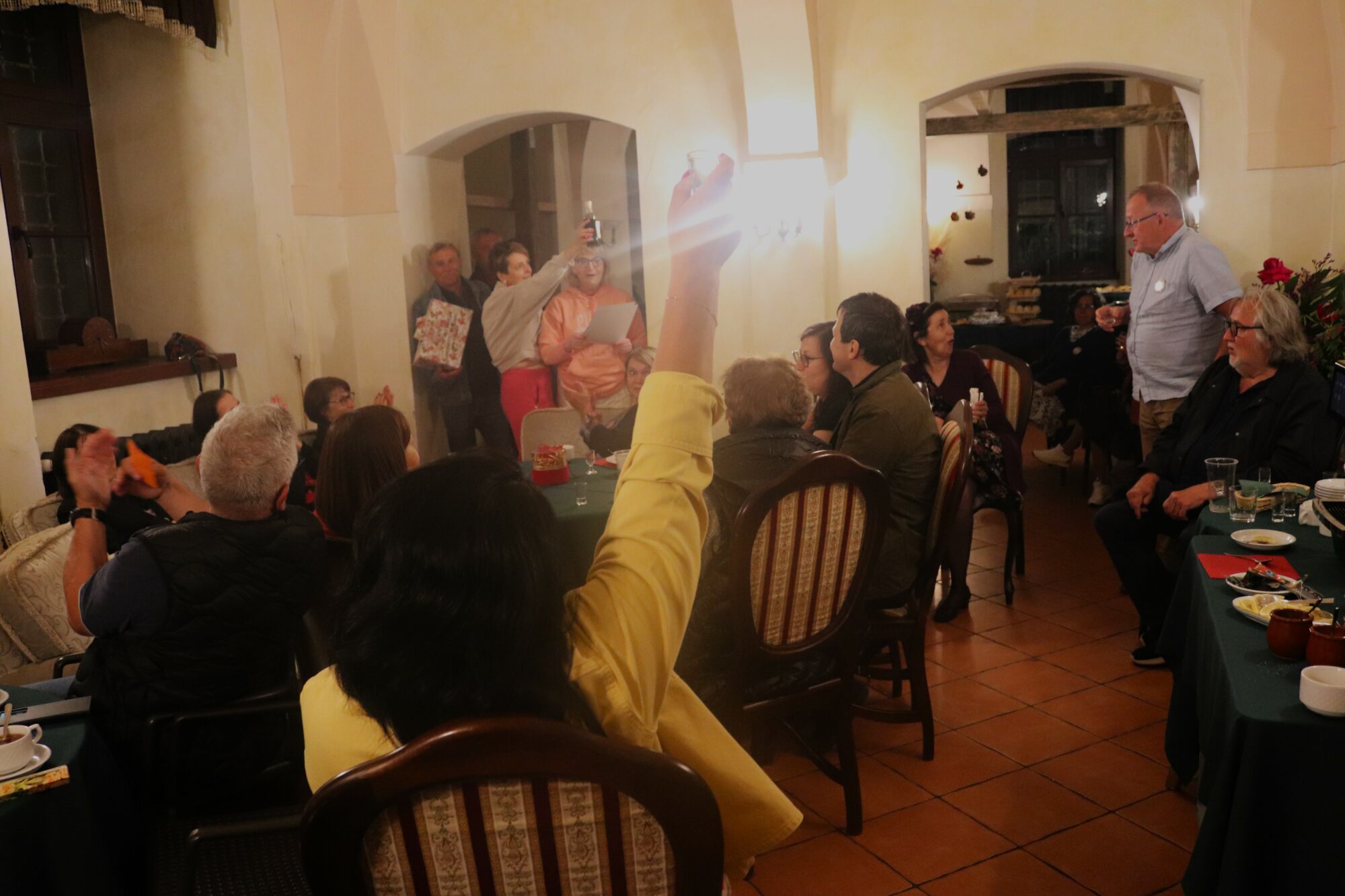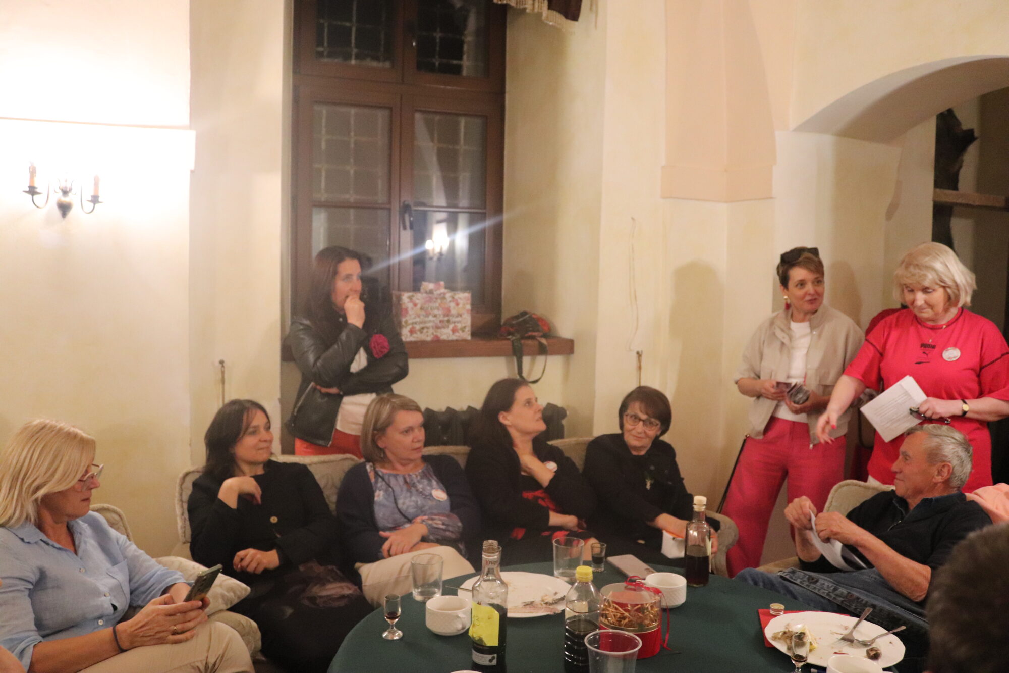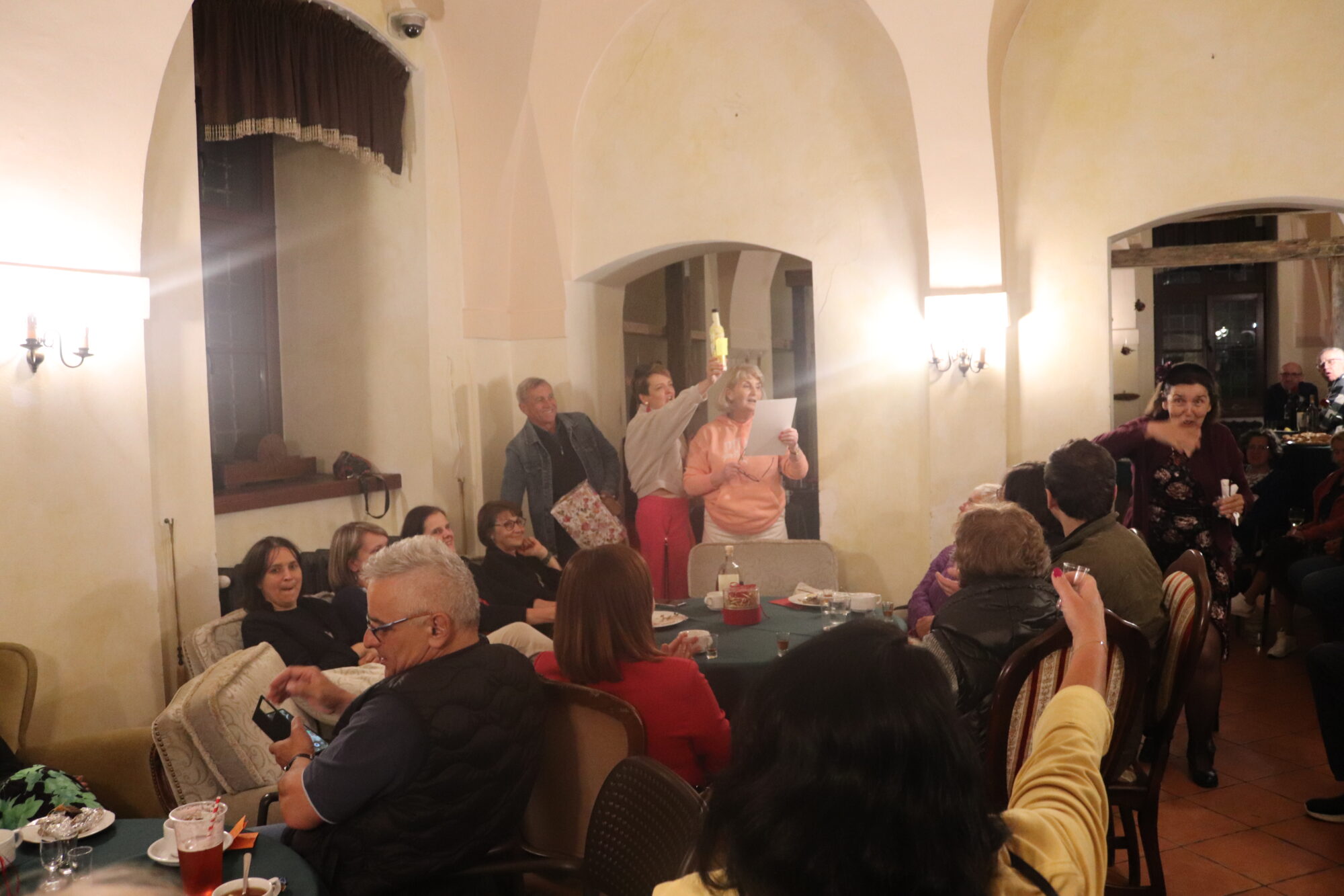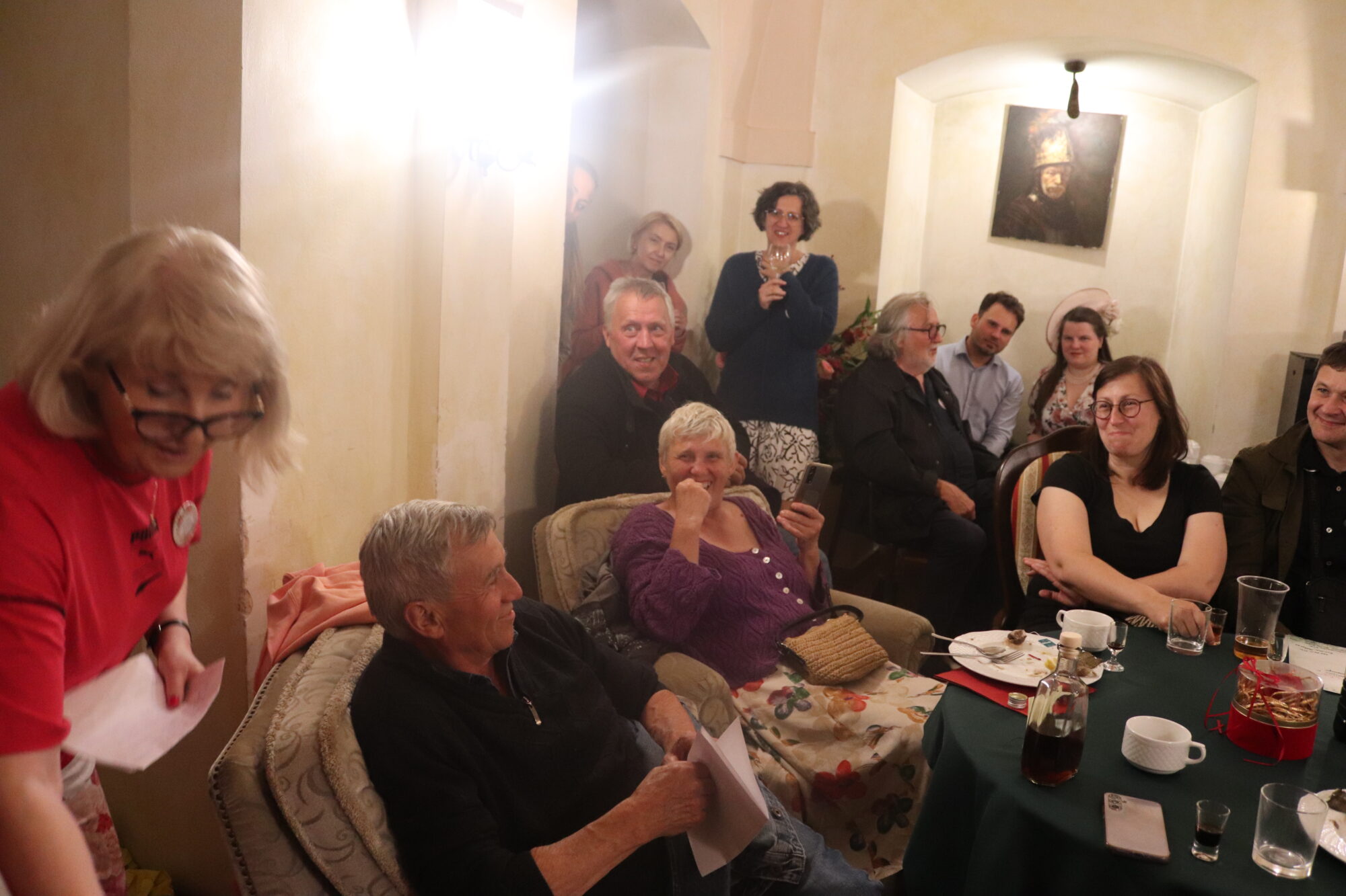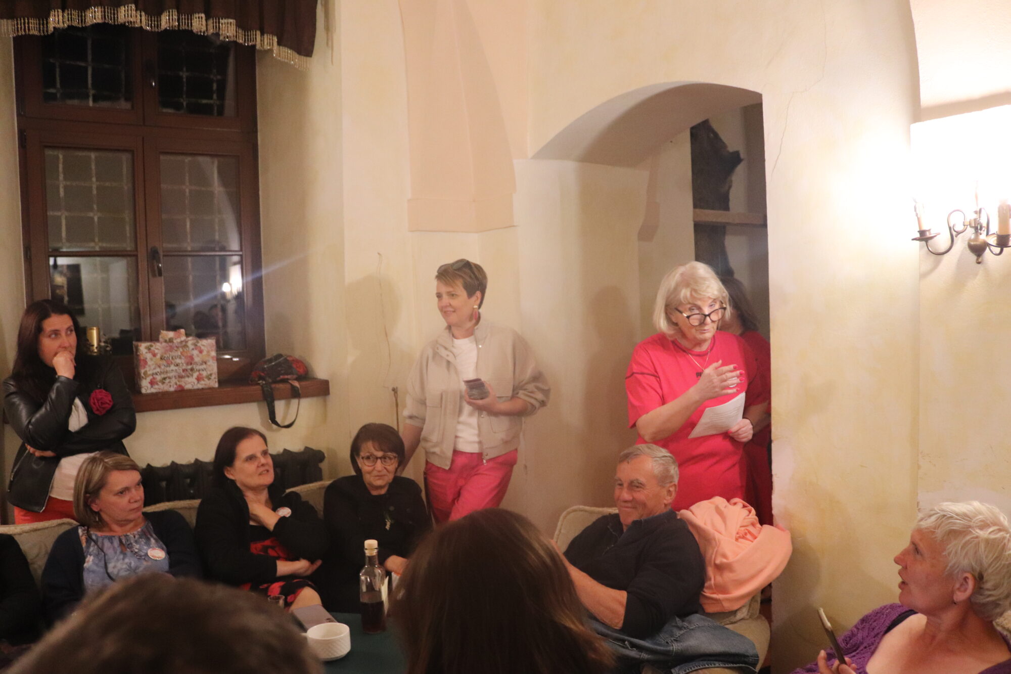 Degustacja, rozpoznawanie składników i ocena nalewek trochę trwało. Zrobiło się ciemno i zimno. Grupa przeniosła się więc do pomieszczeń zamkowych, gdzie odbyło się ogłoszenie wyników i poznaliśmy zwycięzców konkursu nalewkowego. Po ogłoszeniu wyników nalewki mogli już kosztować wszyscy – butelki poszły w ruch.