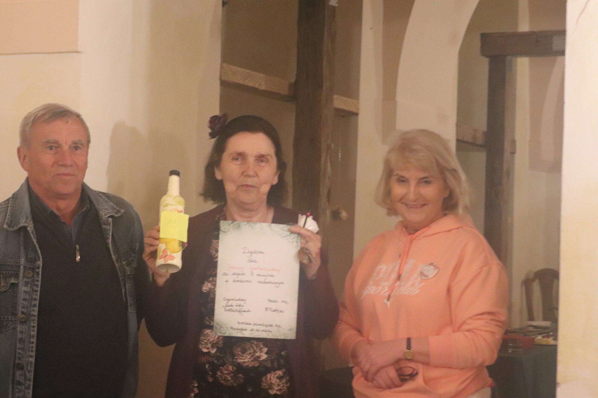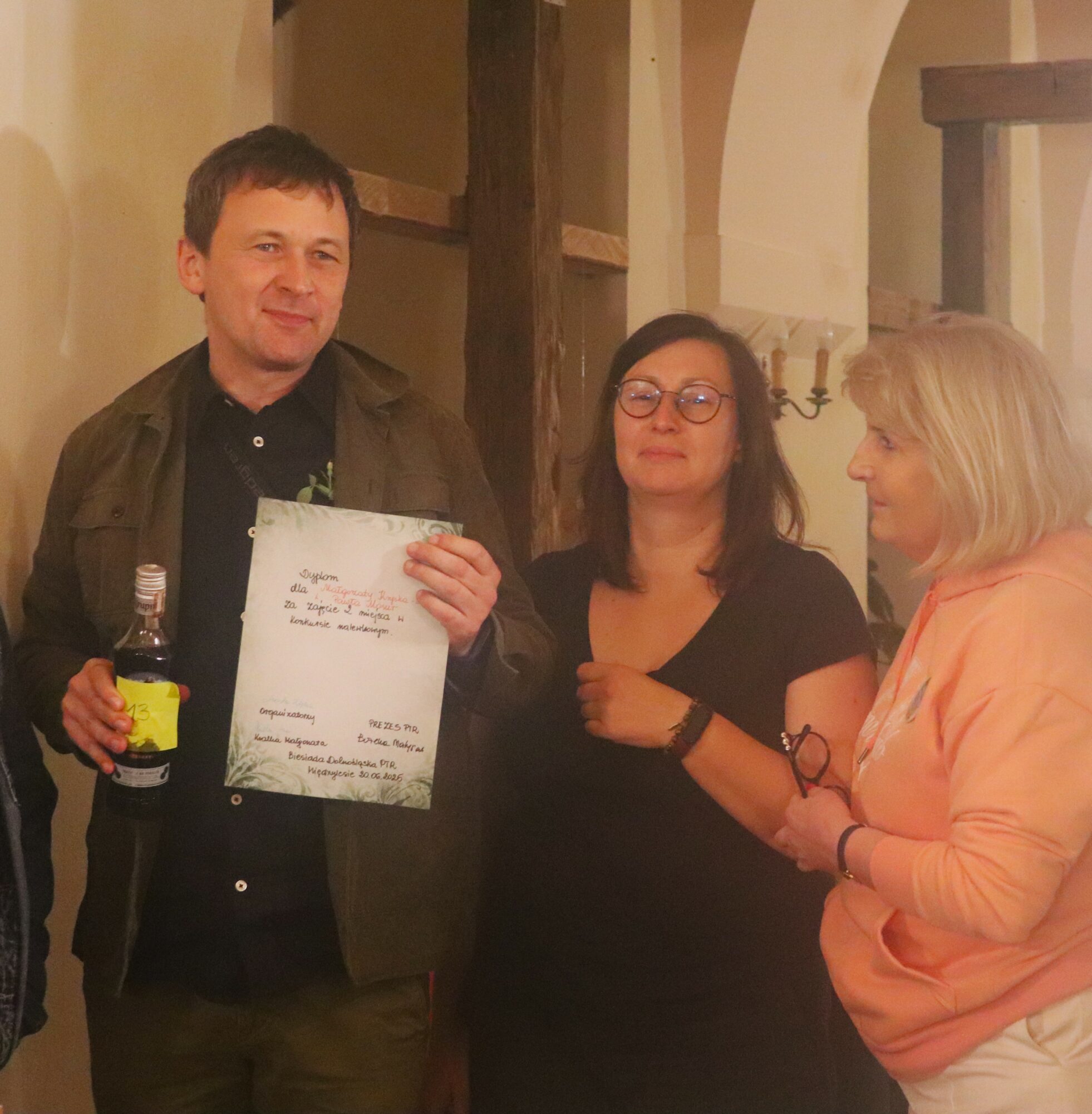 3. miejsce ex aequo zdobyli: Państwo Svietka i Piotr Hoffman za nalewkę różaną oraz Joanna Czartoszewska. Weronika Lenarczyk, moderator ceremonii wręczenia nagród, prezentuje zwycięską nalewkę, Piotr Hoffman jest proszony do odebrania pamiątkowego dyplomu.