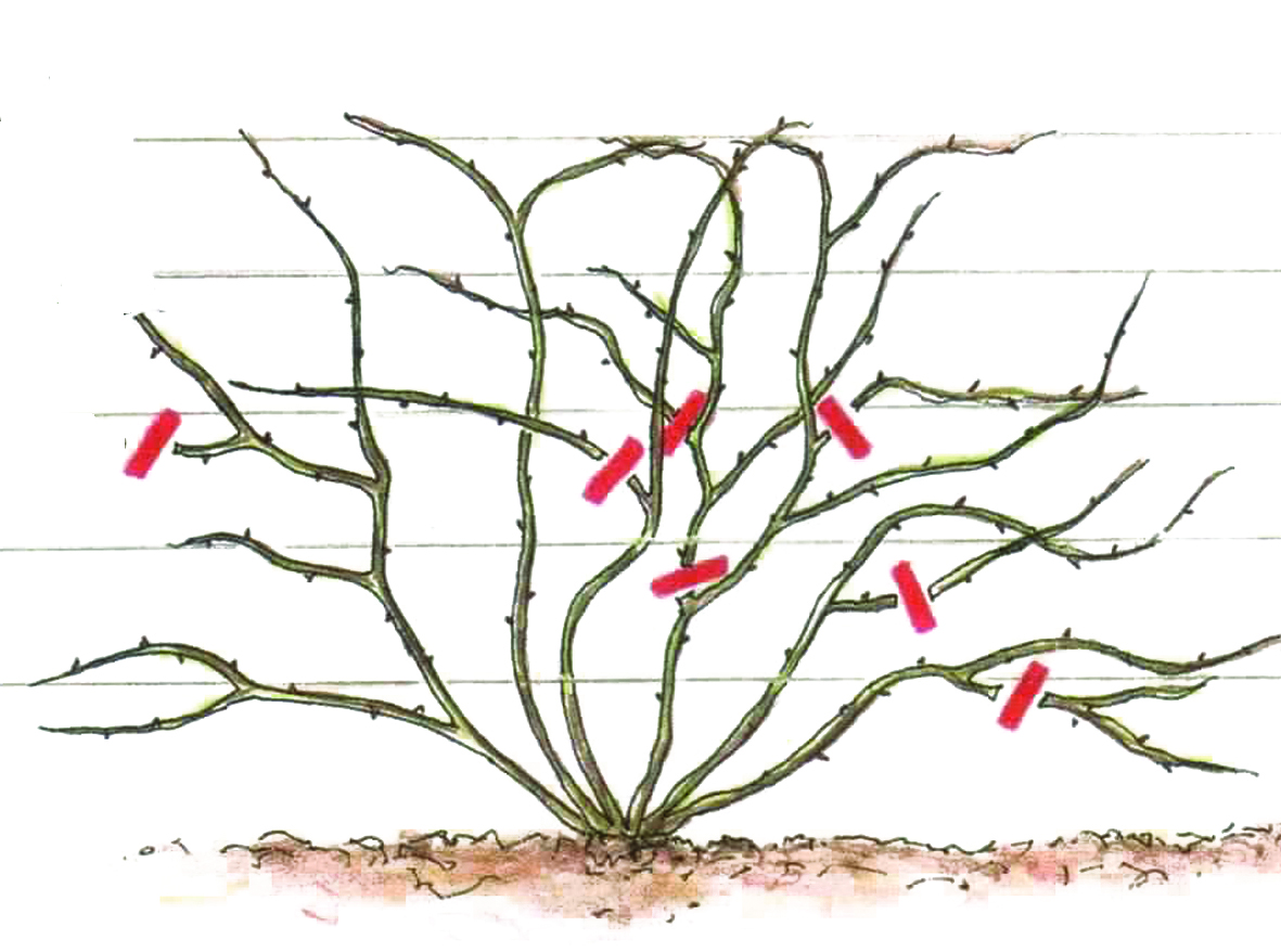 - Odmiany powtarzające kwitnienie: przycinamy na początku wiosny, skracając pędy o jedną trzecią długości. Po pierwszym kwitnieniu w lipcu przycinamy ponownie najmłodsze przyrosty o jedną trzecią długości.