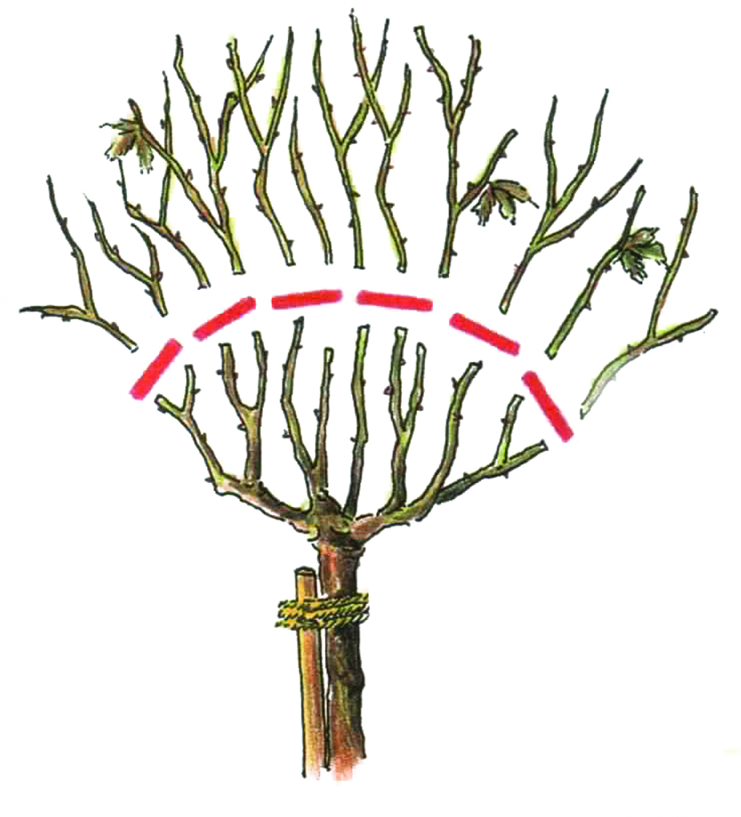 Wczesną wiosną przycinamy jedynie końce pędów bocznych z zeszłorocznymi owocami. Główne cięcie stosujemy dopiero po kwitnieniu w lipcu. Skracamy tylko tyle, aby zachować pożądany rozmiar krzewu. Usunięcie bardzo starego drewna zachęci do wyrastania młodych przyrostów u nasady krzewu. Regularnie upinamy horyzontalnie długie pędy do podpór, aby pobudzić wyrastanie bocznych krótkopędów.