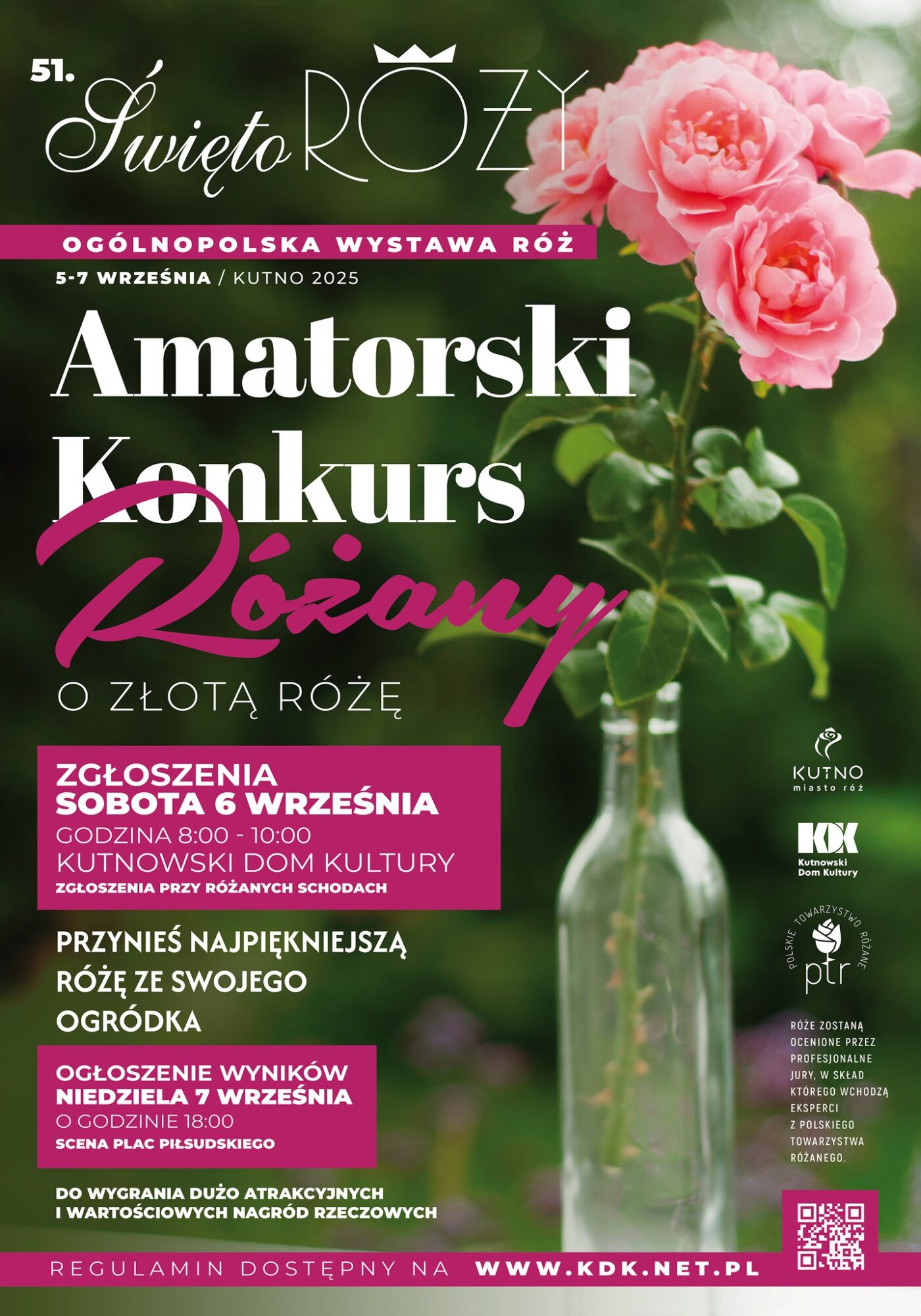 6 września 2025r. (sobota), podczas 51. Święto Róży Kutno 2025 , odbędzie się kolejna edycja Amatorskiego Konkursu Różanego. Wszystkich amatorów ogrodników zachęcamy do zapoznania się z regulaminem i zapraszamy do udziału! Eksponaty zgłaszane do Konkursu będą przyjmować członkowie Polskiego Towarzystwa Różanego w godz. 8-10. Do wygrania jest całe mnóstwo atrakcyjnych nagród, a ogłoszenie wyników odbędzie się 7 września (niedziela). W konkursie może brać udział każdy amator i nie ma żadnych ograniczeń ze względu na miejsce zamieszkania. Zatem miłośnicy róż – przybywajcie do Kutna z najpiękniejszymi różami ze swojego ogrodu!