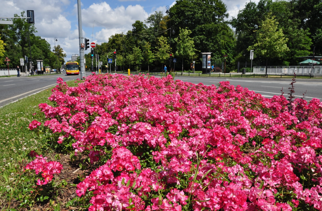 Mała róża krzaczasta, idealna do ogrodów i otwartych terenów zieleni.