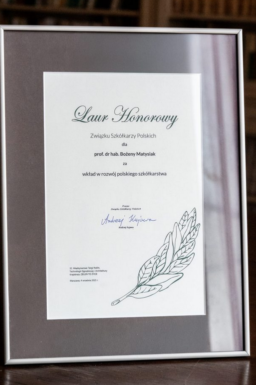 Z radością informujemy, że prof. dr hab. Bożena Matysiak została uhonorowana Honorowym Laurem Związku Szkółkarzy Polskich 2025 za wybitny wkład w rozwój polskiego szkółkarstwa. Wyróżnienie to przyznawane jest osobom, które poprzez swoją działalność zawodową, popularyzatorską i edukacyjną na najwyższym poziomie merytorycznym przyczyniają się do rozwoju branży szkółkarskiej w Polsce.