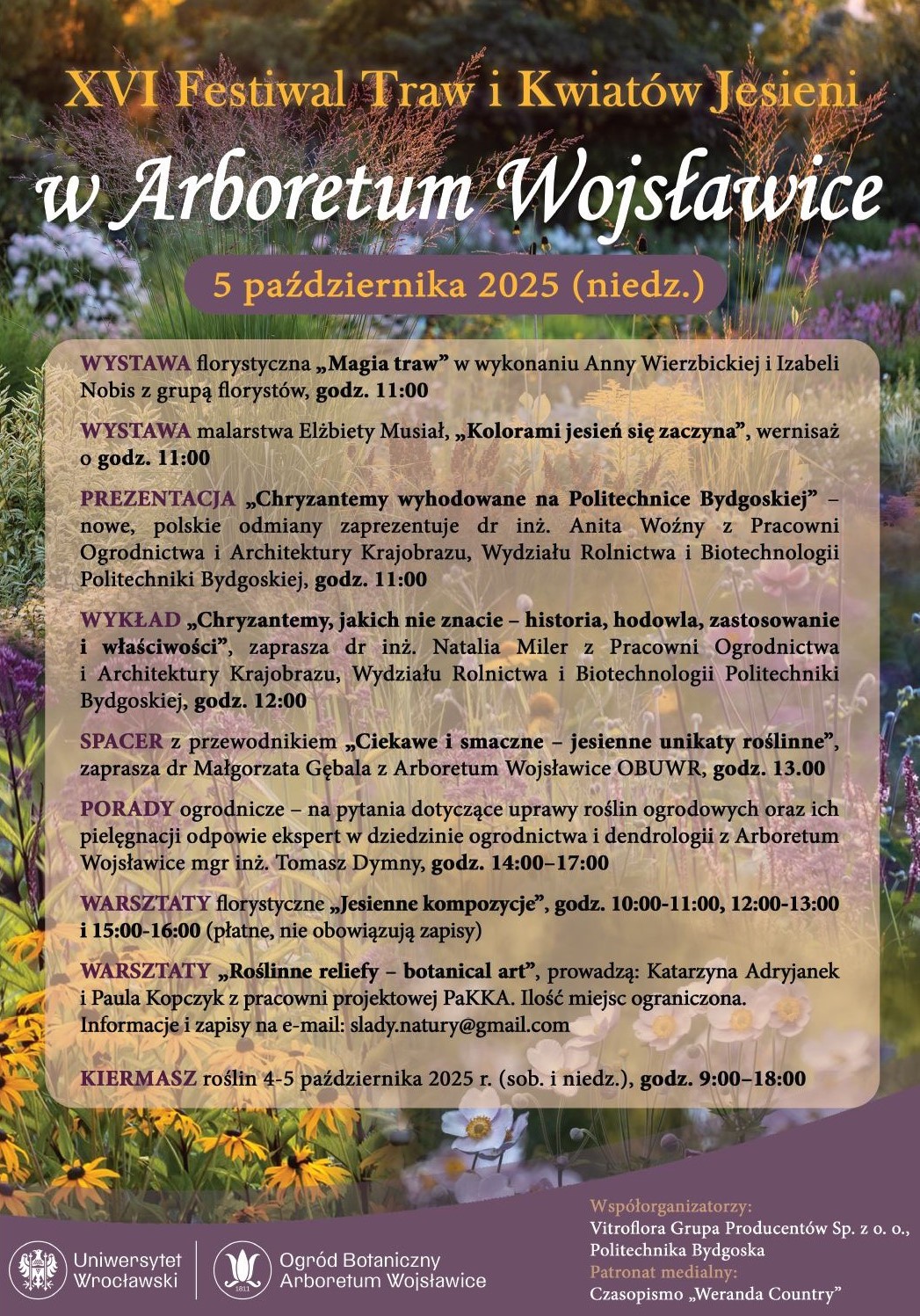 W dniu 5 października (niedziela) 2025r. Arboretum Wojsławice zaprasza na XVI Festiwal Traw i Kwiatów Jesieni. Ogród powoli zaczyna przybierać barwy jesieni i prezentuje się równie wspaniale, jak w innych porach roku. Warto przyjechać do Arboretum przed przerwą zimową, która rozpocznie się po ostatnim weekendzie października.
