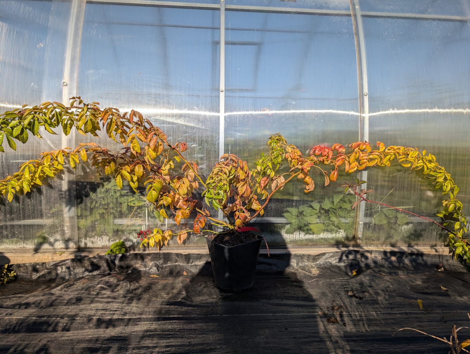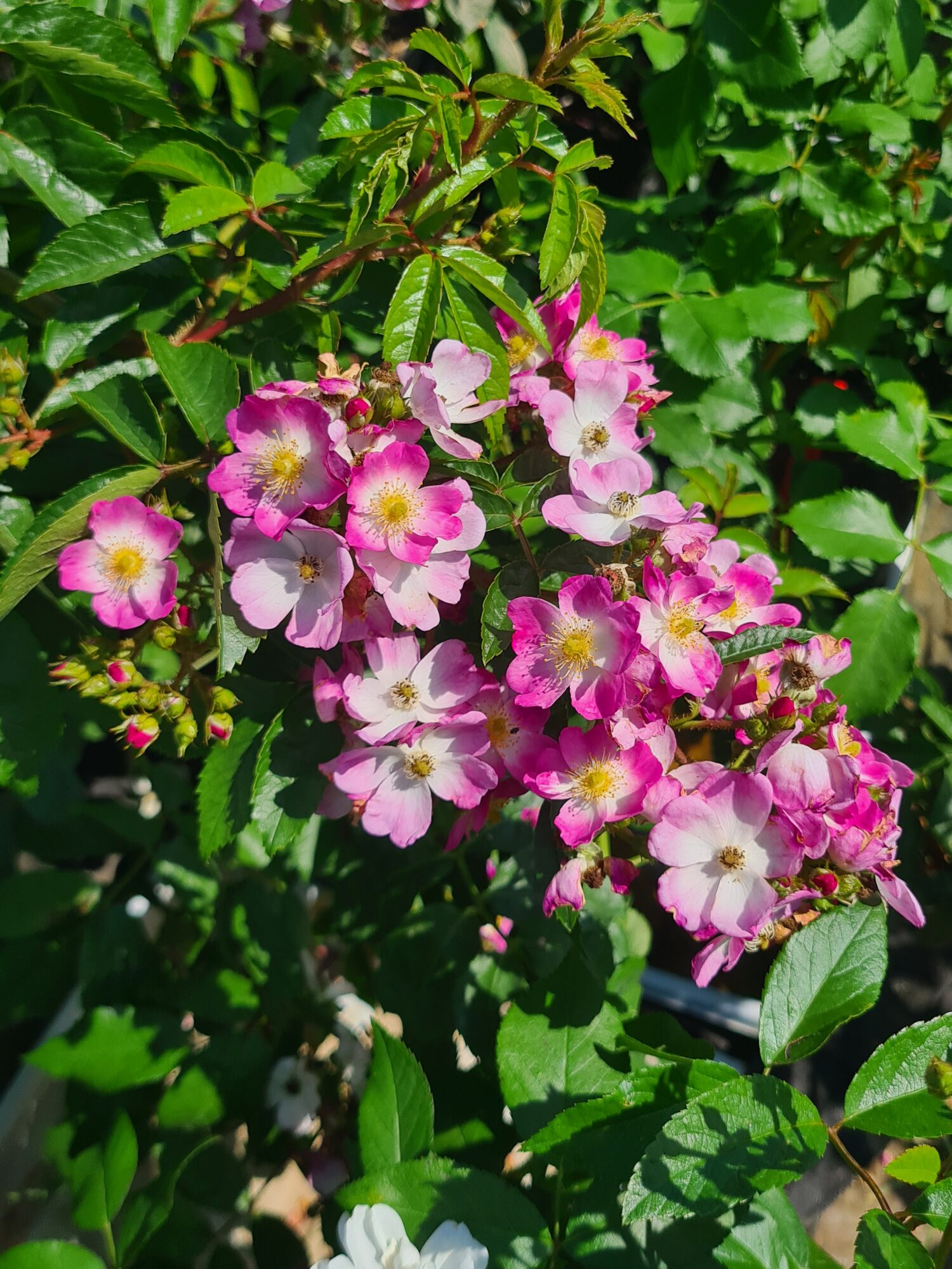 Róża pnąca powtarzająca kwitnienie, kwiaty w dużych bukietach, VI-XI, owoce dekoracyjne jesienią i zimą, liście bardzo zdrowe, pięknie przebarwiają się jesienią od żółtego do czerwonego, wysokość 2-3 m, całkowicie mrozoodporna w naszym klimacie.