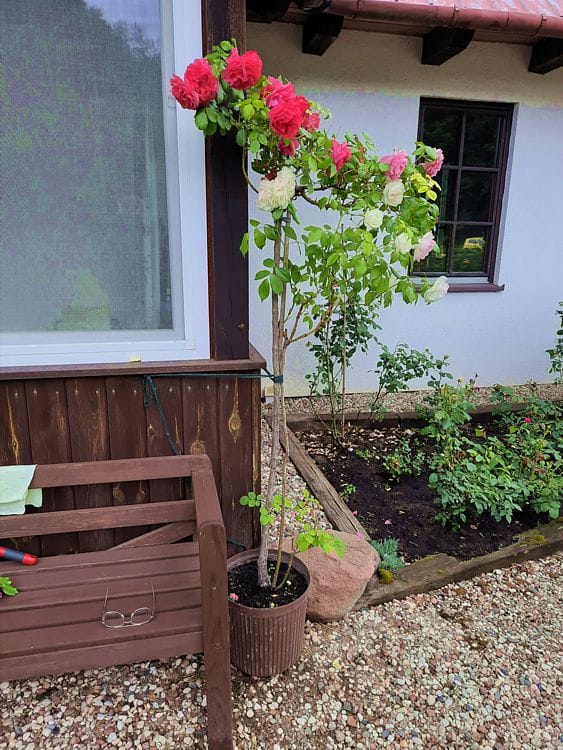 Róże Pan Tadeusz Kurek z powodzeniem uprawia w takich samych 10-cio litrowych pojemnikach, co daje nadzieję na sukces tym, którzy nie mają miejsca na duże donice 60, 90 litrowe.